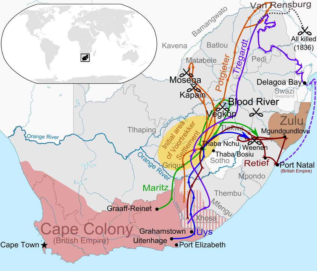 Les descendants des huguenots français ont également été inclus dans l'exode des fermiers de la frontière appelé le Grand Trek (une migration collective de plusieurs milliers de Boers de la colonie du Cap vers l'intérieur des terres d'Afrique du Sud dans les années 1835-1840 afin de concrétiser un désir d'indépendance politique de ces Boers par rapport aux autorités coloniales britanniques).