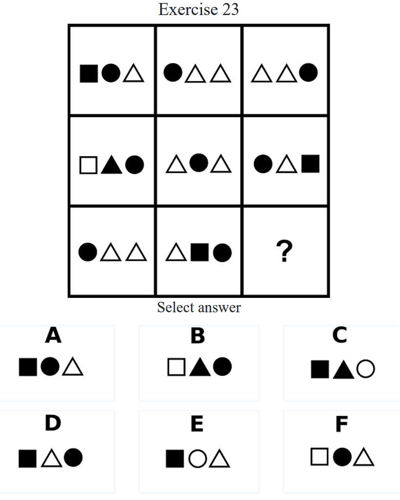 - Les motifs C et E comportent des figures qui ne sont jamais apparues dans le tableau => à éliminer