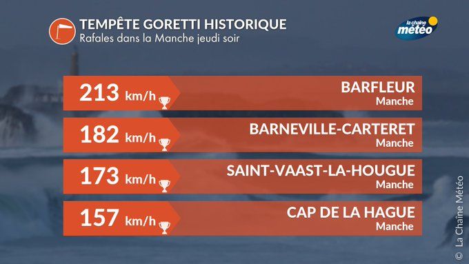 Outch ! Déjà une pointe à 213km/h à Barfleur, pointe intérieur du Cotentin.
