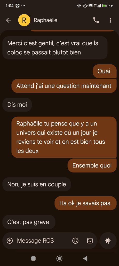 Plus jamais ce genre de message la prochaine fois je roule une pelle et soi elle me met une claque soit on est ensemble