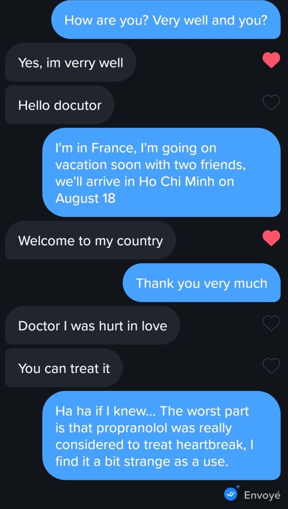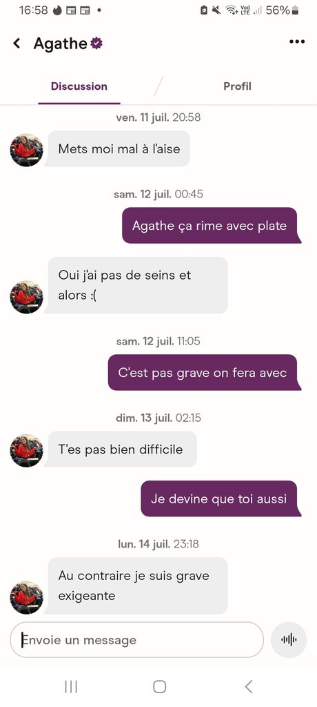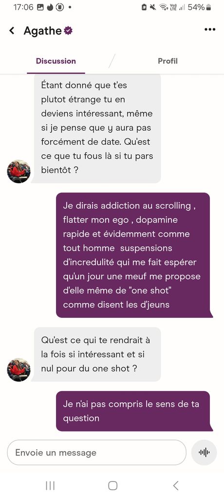 J'ai plus le screen mais une fois j'avais écrit "Merci ! 😉" et la fille m'avait répondu "Euh de rien mais pourquoi t'envoie un point d'exclamation ?"