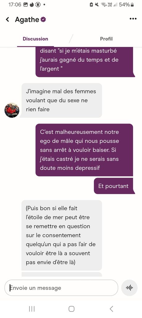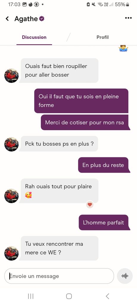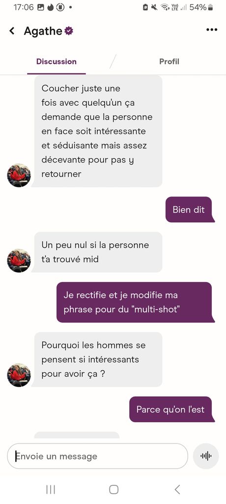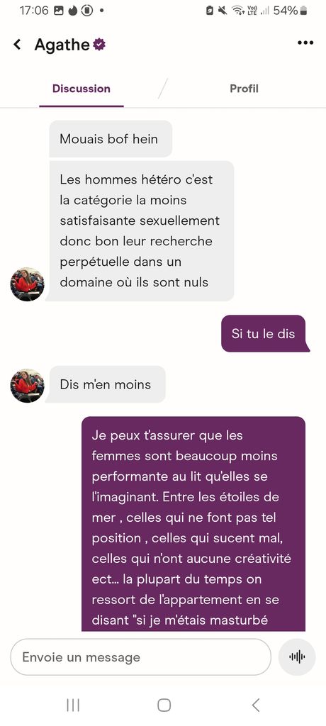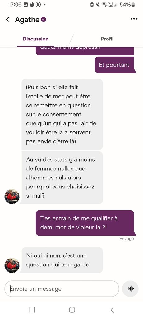 La discussion est ultra longue donc flemme de tout poster mais elle était perchée un peu