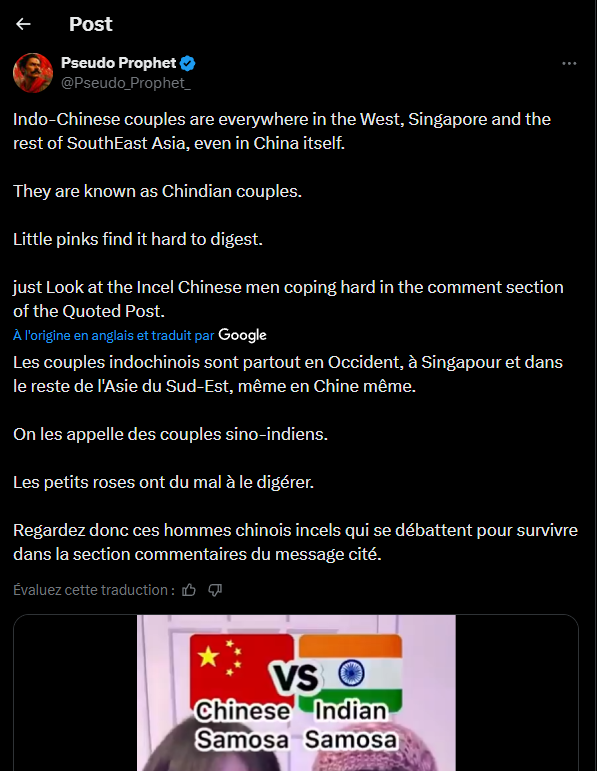 Technique classique du pajeetin, il trouve une vidéo d'un "couple" entre un des membres de son ethnie et un autre du pays sur lequel il passe son temps a taper dessus, tire une conclusion comme quoi ce genre de couple est très en vogue et que en l'occurrence ici les hommes chinois qui ragent dessus dans les commentaire sont des incels et qu'ils sont sous perfs de copium 3000mg Image