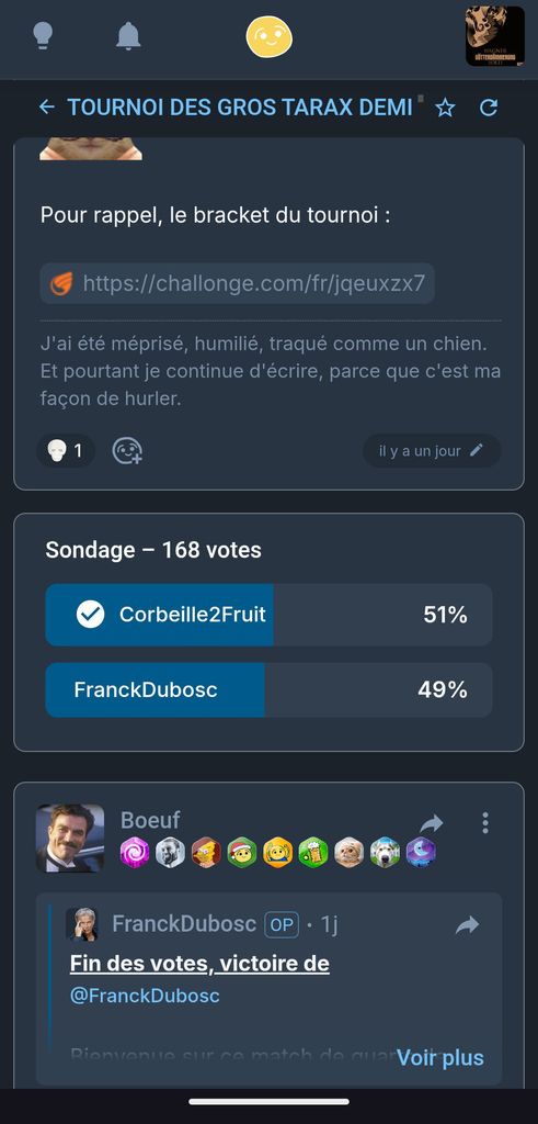 Et d'ailleurs @Franckdubosc Tu es prié de corriger le score fautif sur le bracket du tournois : à 18h pile (puisque selon toi c'est l'horaire qui fait autorité) le screen indique 50/50 et pas 49/51 comme tu l'as écrit avec malhonnêteté