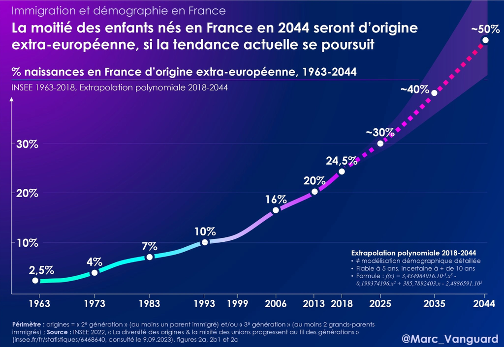 Le nombre d'entrées de non-Blancs augmente chaque année, la proportion de naissances non-Blanches augmente chaque année et va bientôt passer la barre des 50 %, le baby-boom quasi full Blancs va mourir dans les années à venir mais oui les Blancs vont rester majoritaires en France on y croit