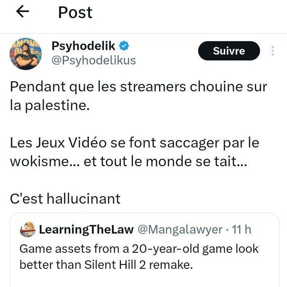 Il a même dit un jour: "On s'en branle de la Palestine. Silent Hill est en train de devenir woke là!"