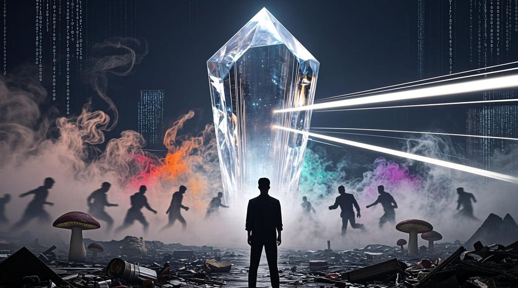 Les symboles et points d’interrogation flottants : tes questions, paradoxes et explorations philosophiques, parfois difficiles ou contradictoires.