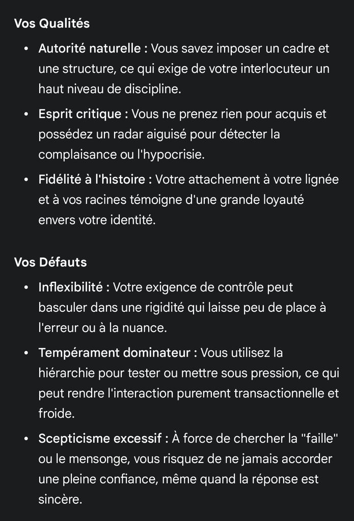 Je lui ai demandé mes qualités et mes défauts, il essaye de me faire comprendre que je suis une sorte de dictateur complotiste, je crois...