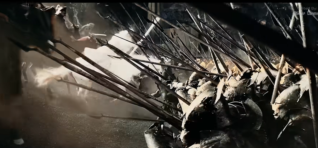 Las famosas picas levées. Elles doivent embrocher les chevaux. Ils doivent se faire clouer sur place, les cavaliers doivent passer par-dessus et se faire démonter. Et même sans les piques, la masse d'uruk est trop importante pour se faire démembrer en 2 secondes.