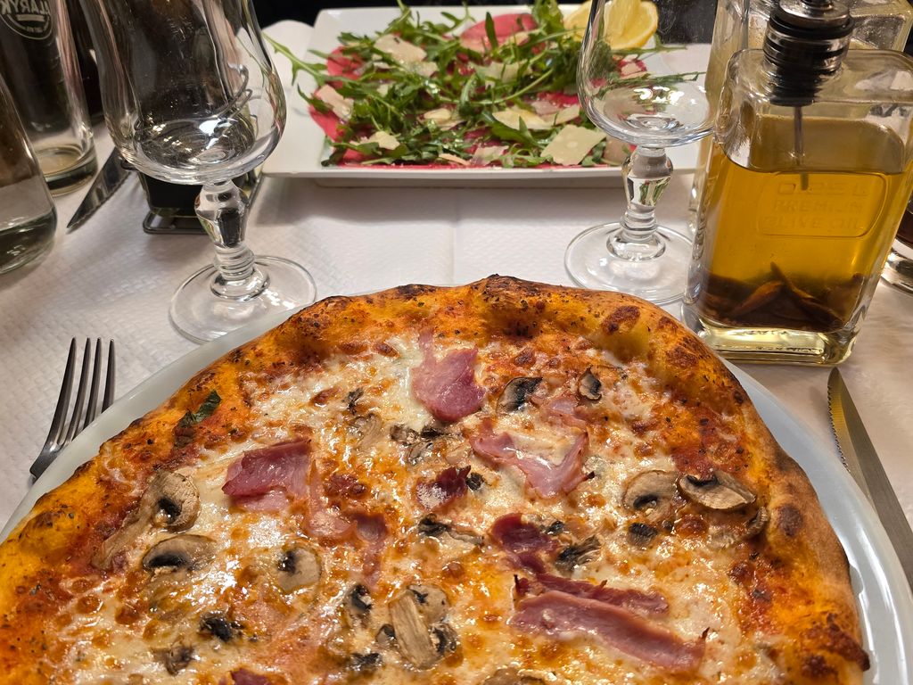 Je crois que c’est une pizza champignons jambon de montagne fromages, mais l’exécution est vraiment pas mal, j’espère que y’a le même type de pizza pas loin de chez moi