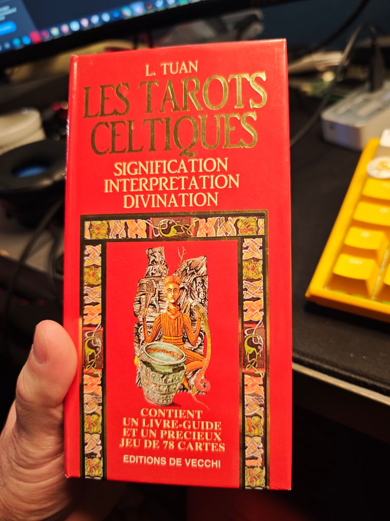 Tu lui prend un tarot divinatoire de 78 arcanes et un livre d'apprentissage (genre le tarot divinatoire pour les nul)