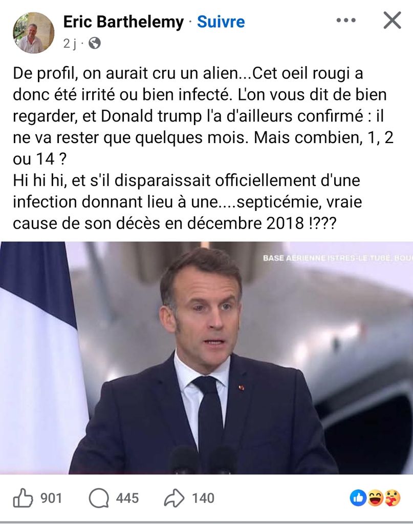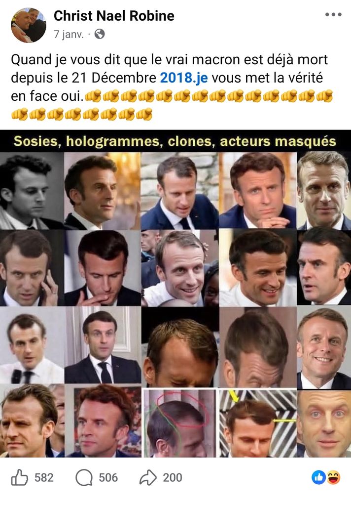 Selon certaines rumeurs, Macron serait né sous le nom d'Emmanuelle de Rothschild et serait mort d'une septicémie le 21 décembre 2018 suite à une énième opération de changement de sexe ayant eu lieu en octobre 2018 et qui aurait mal tourné.