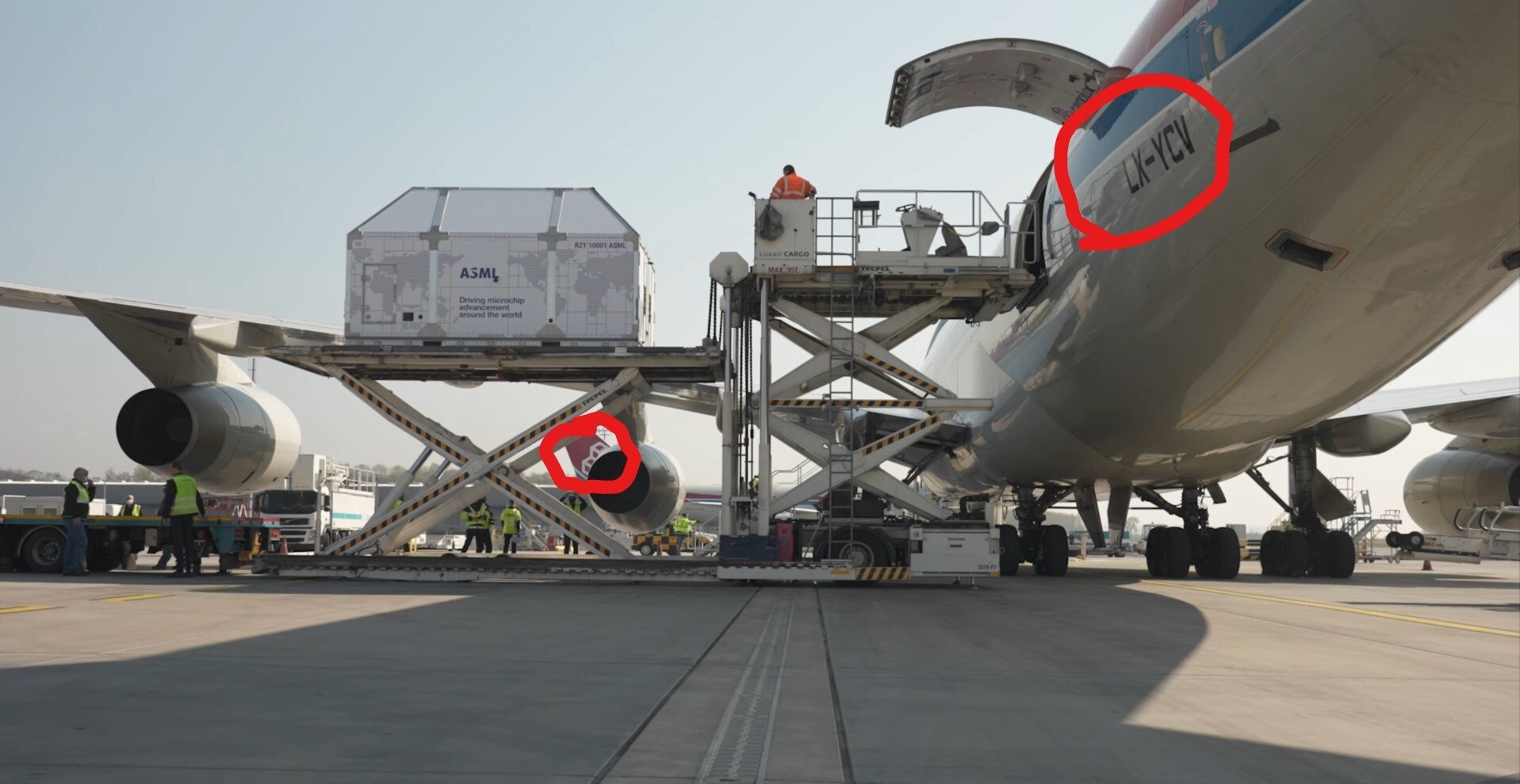 On reconnait derrière, l'aile de l'avion avec le logo Cargolux, rouge avec 3 boites, et l'immatrication de l'avion de l'avion principal : LX-YCV qui est un avion de CargoLux Italia.