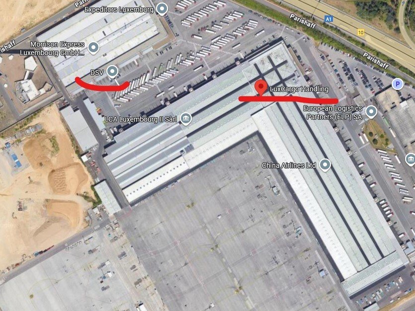 Si on va sur Google Maps, on voit que l'entrepôt DSV et Luxair Cargo sont justement voisins :