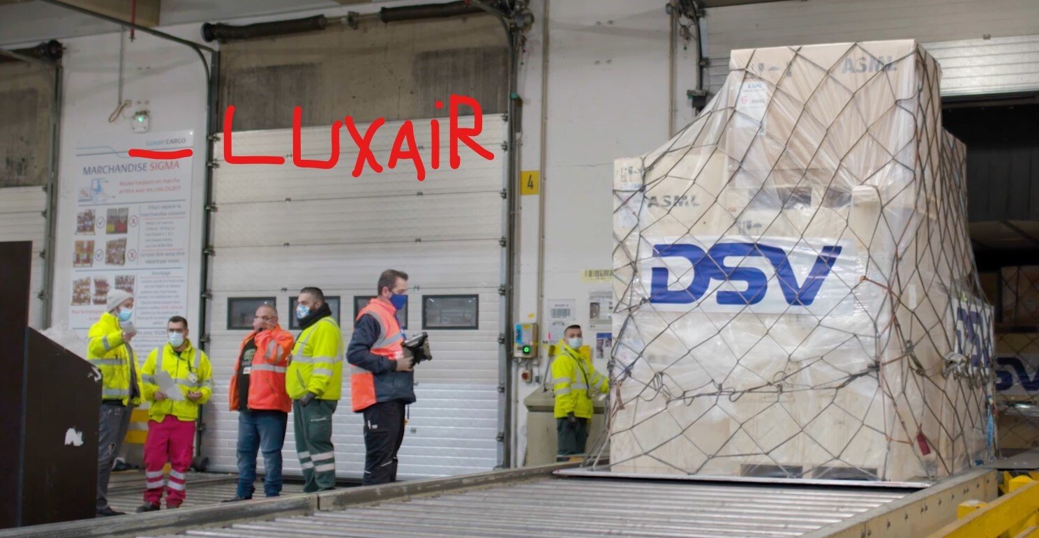 Aussi, on trouve sur l'image à 49:41 le logo "DSV" sur le plastique de la palette avion et si on regarde bien au mur à gauche, on détecte "Luxair cargo".