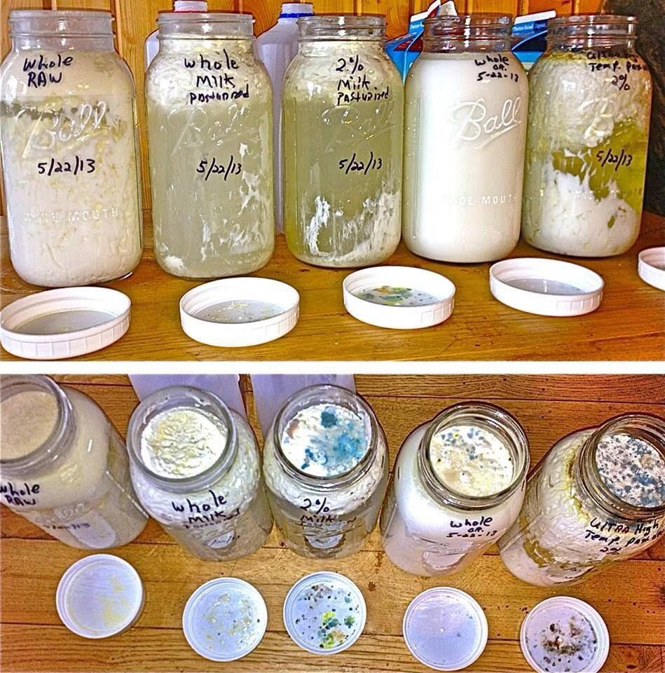 tout à gauche c'est du lait cru et à droite c'est du lait pasteurisé après quelques mois sans frigo, on remarque bien l'efficacité de la flore microbienne pour tenir un équilibre avec le lait cru