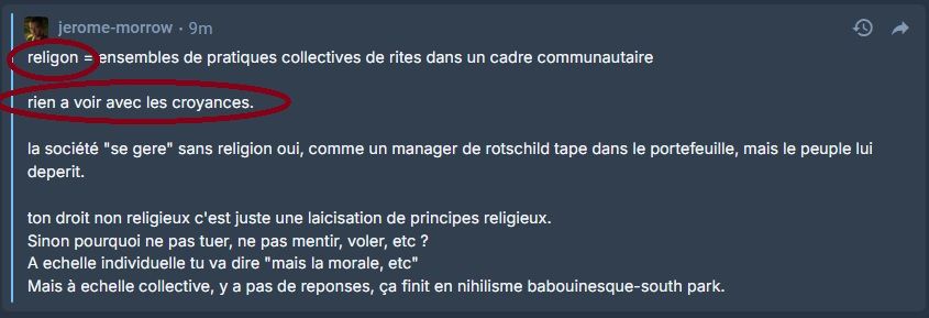 Par contre, quand tu nous sors, c'est une religion le droit séculier et les institutions, tu sais c'est quoi la définition d'une religion au lieu de tout mélanger ? Parce que tu peux très bien gérer une société sans religion, c'est pas parce que les financiers posent des problèmes que la religion est la solution, vu que tu peux faire du droit non religieux pour appliquer des sanctions sur des financiers.
