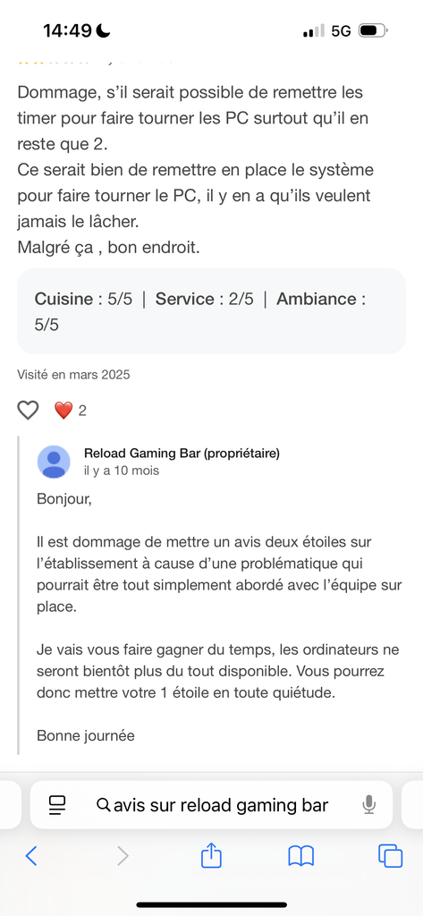 Le client fait une critique plutôt constructive, il dit que c’est un “bon endroit”, donne 5/5 à la cuisine et à l’ambiance, et suggère juste de remettre les timers pour les PC. C’est pas méchant du tout.