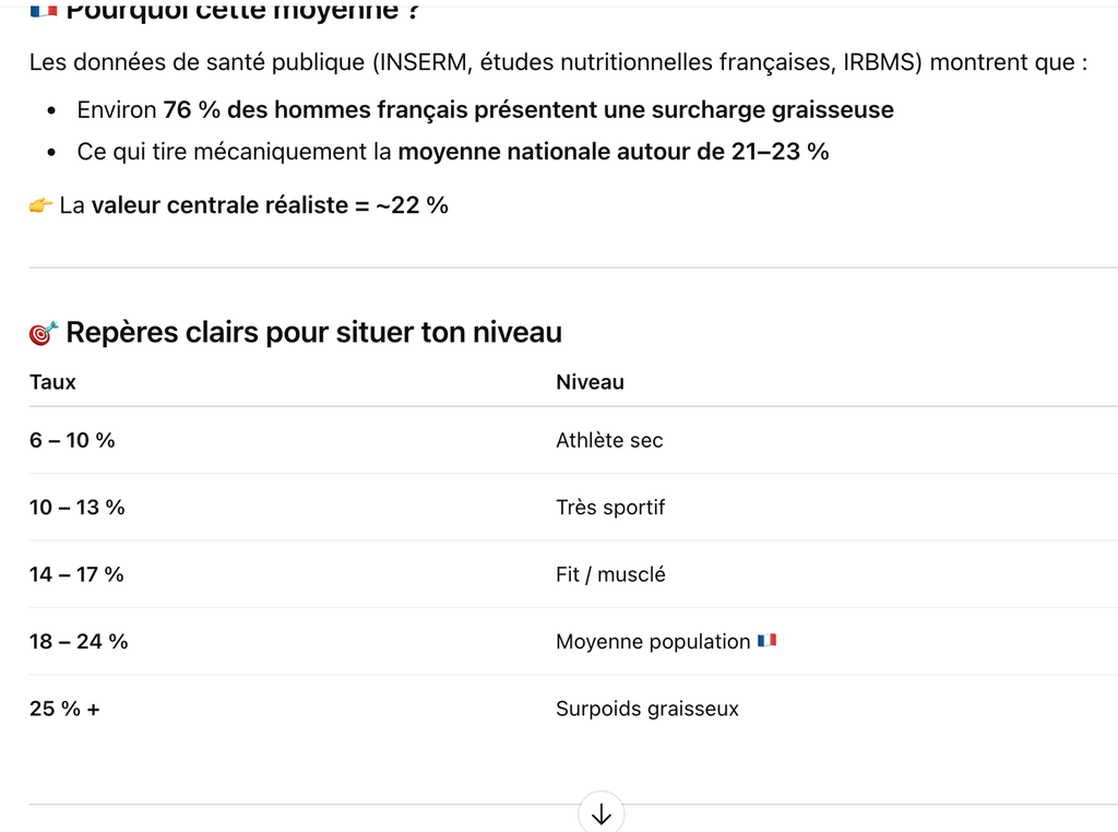4% de bodyfat c'est impossible pour le commun des mortels les descos, rien que les gaines de myéline et les membranes cellulaires imposent une limite à 3-4%, ensuite il restera du gras, même un peu, donc disons 5-6% mini d'un point de vue physiologique