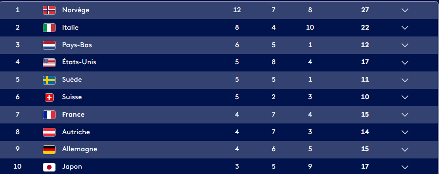 Résumé de la journée de la 9ème journée olympique ( 15 février 2026 ) en terme de médailles :