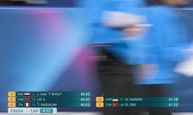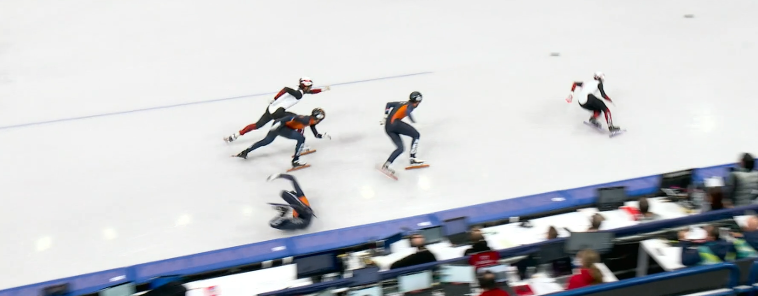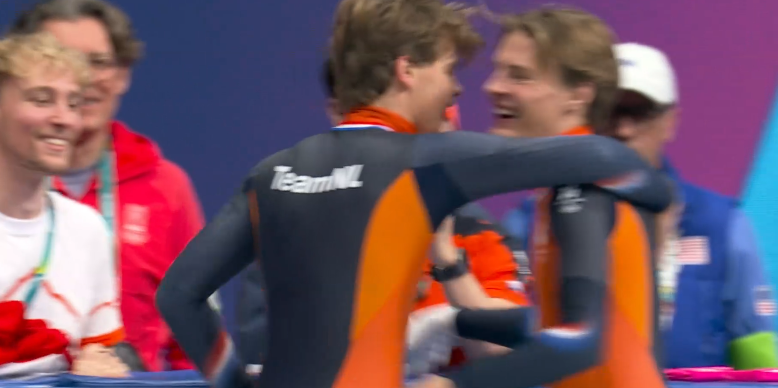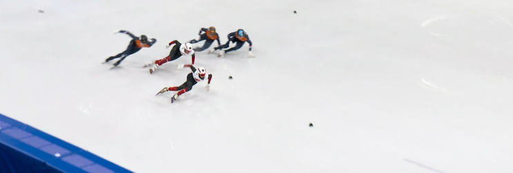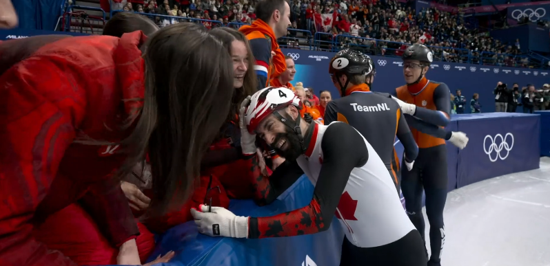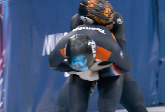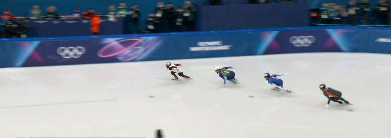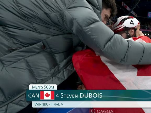 Le Canadien Steven Dubois champion olympique du short track 500 mètres hommes devant les 2 frères Wout ( néerlandais ).