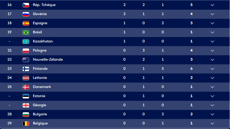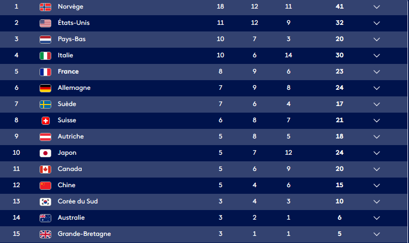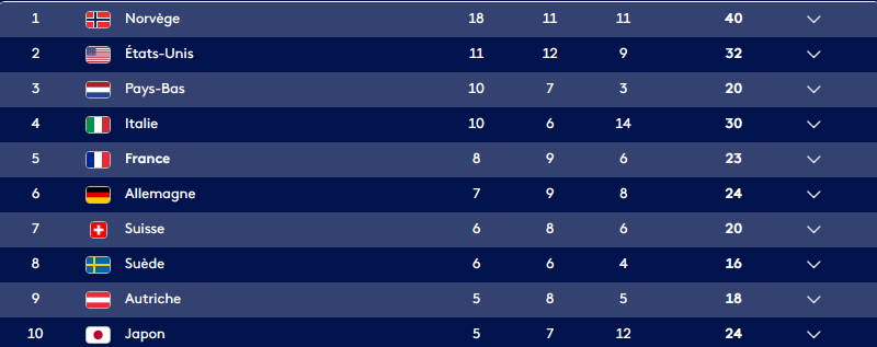 Ils ont pas actualisé encore mais là la Suède a 7 or. Avec le curling potentiellement 8 or comme la France mais la France a plus de médailles d'argent.