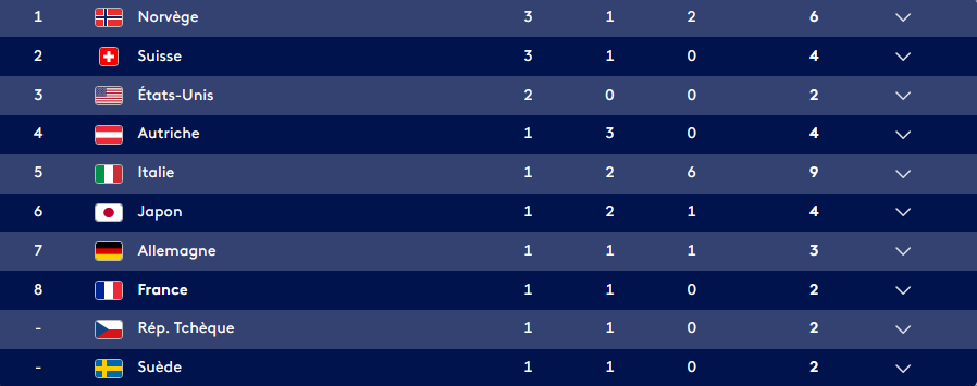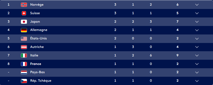Résumé de la journée du 9 février 2026 en terme de médailles :