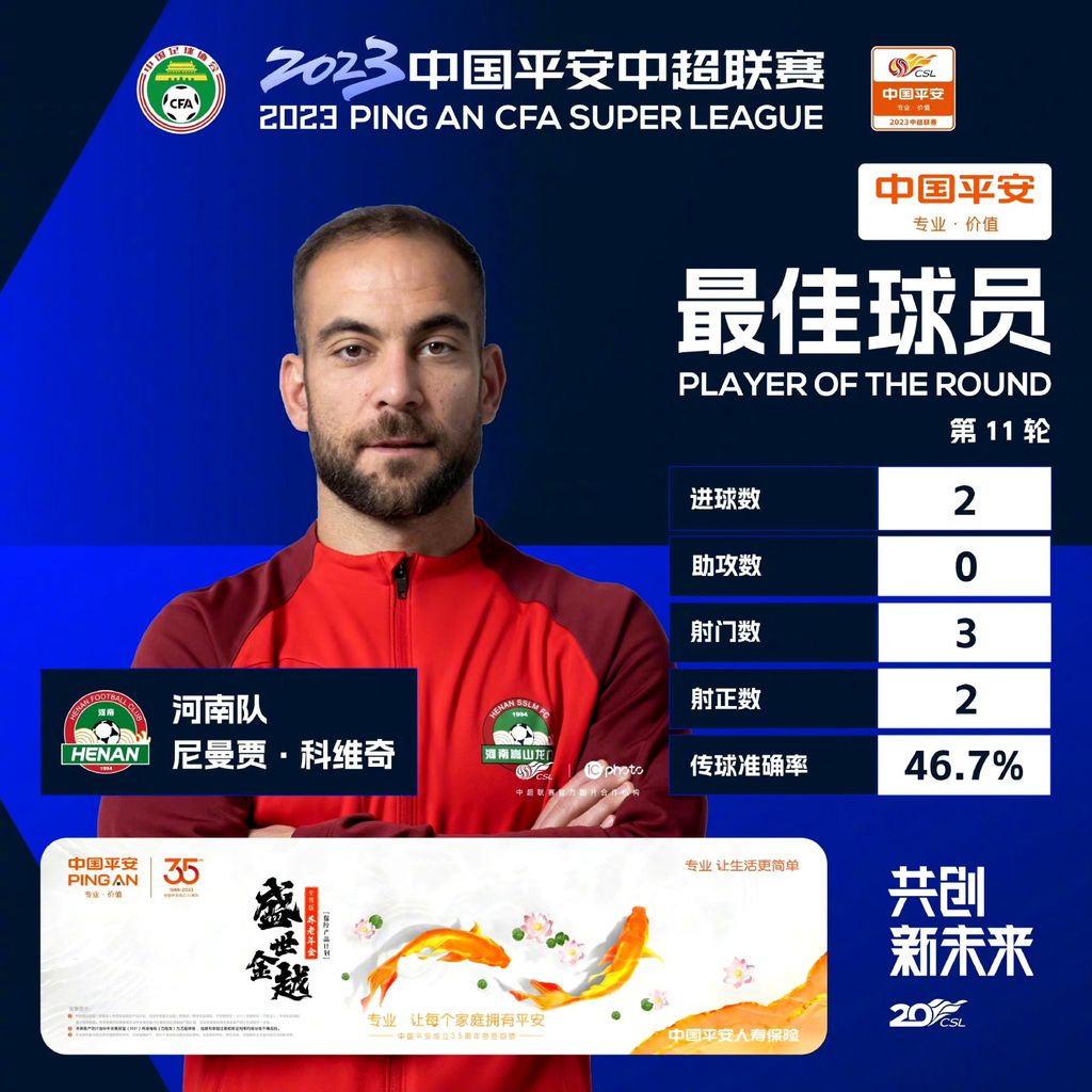 Nemanja Covic attaquant serbe du Henan FC pour son doublé est élu meilleur joueur de la 11e journée :