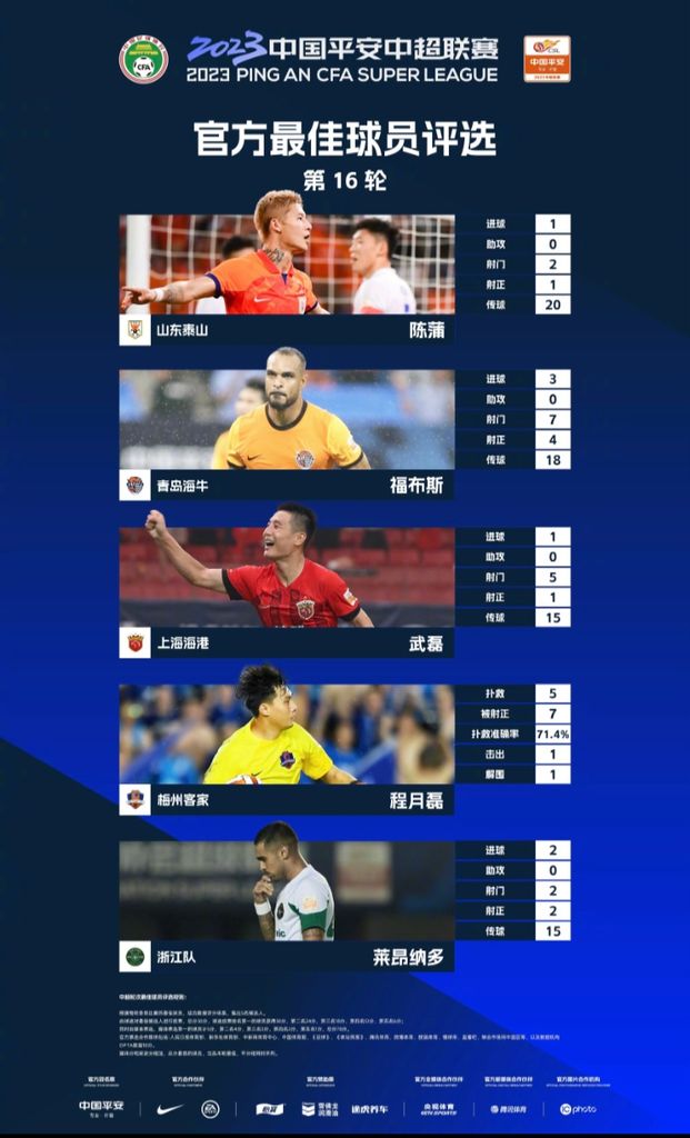 Chen Pu pour son magnifique but contre Shanghai Shenhua, Brown Forbes pour son triplé avec Qingdao Hainiu permettant à ce dernier de quitter la zone de reléguation, Wu Lei pour avoir permis à Shanghai Port de l'emporter sur Wuhan Three Towns le champion en défense, le gardien du Meizhou Hakka Cheng Yuelei héroïque contre Beijing Guoan, Leonardo pour son doublé contre le Changchun Yatai qui creuse l'écart en étant le meilleur buteur du championnat actuellement.