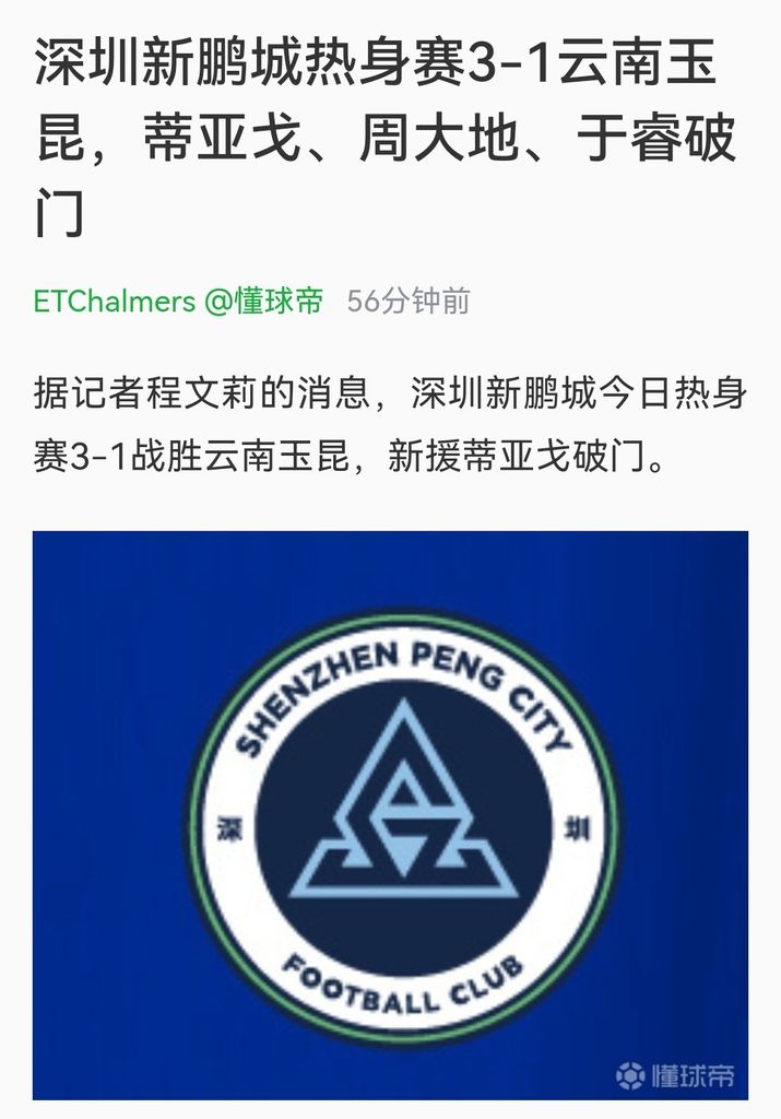 Le Shenzhen Peng City FC s'impose 3-1 face au Yunnan Yunkun (club de China League One la 2nd division) en match de préparation. Les buteurs sont Thiago Andrade, Zhou Dadi et Yu Rui pour Shenzhen.