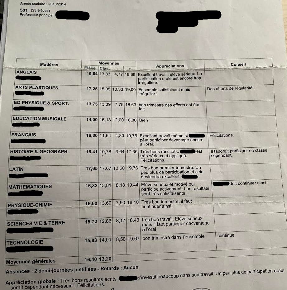 D'ailleurs mon meilleur bulletin n'était pas suffisant pour mes parents parce que mon frère avait toujours minimum 17 de moyenne générale et j'étais censée faire aussi bien
