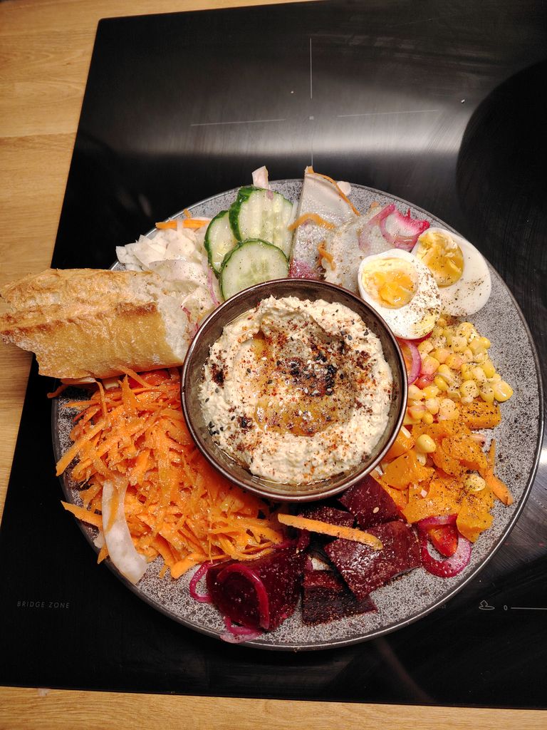 C'est du houmous maison avec de l'huile de sésame, du sumac, du piment d'espelette et du sésame torréfié