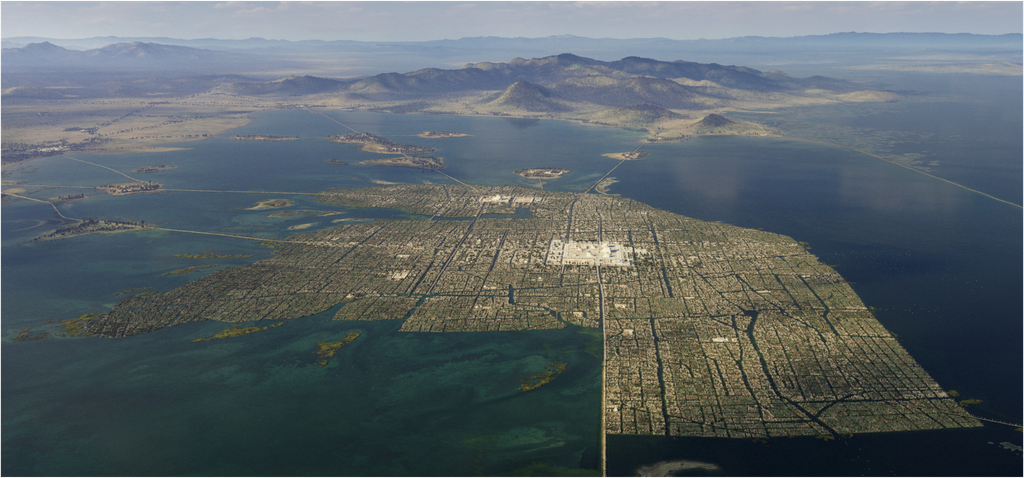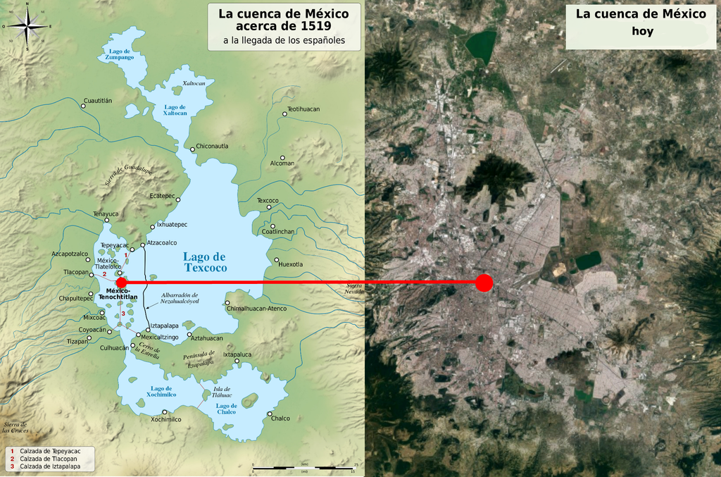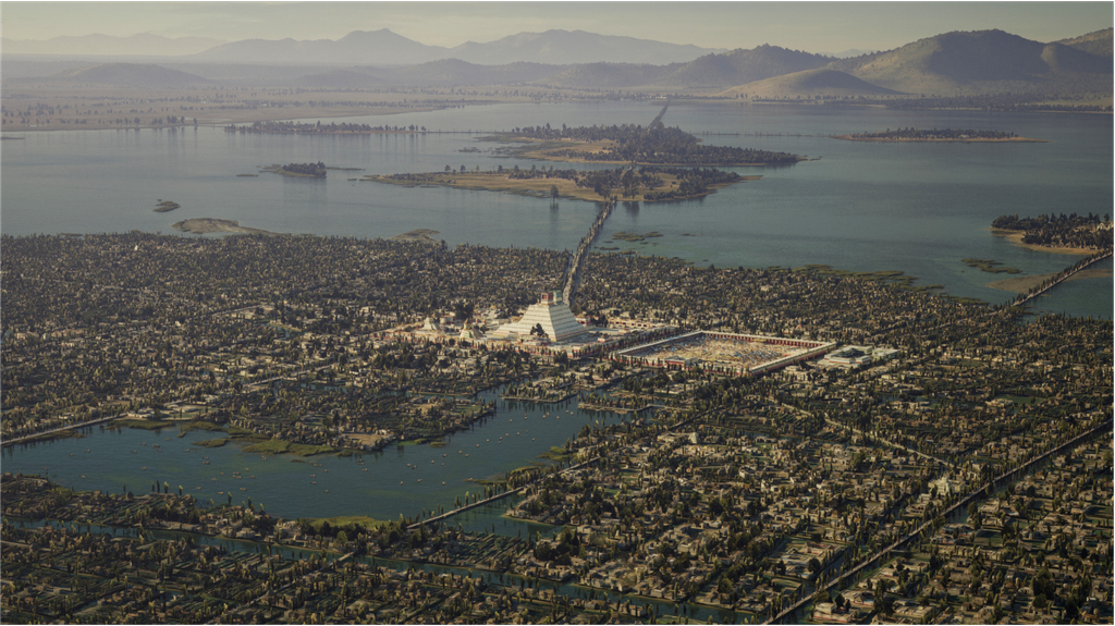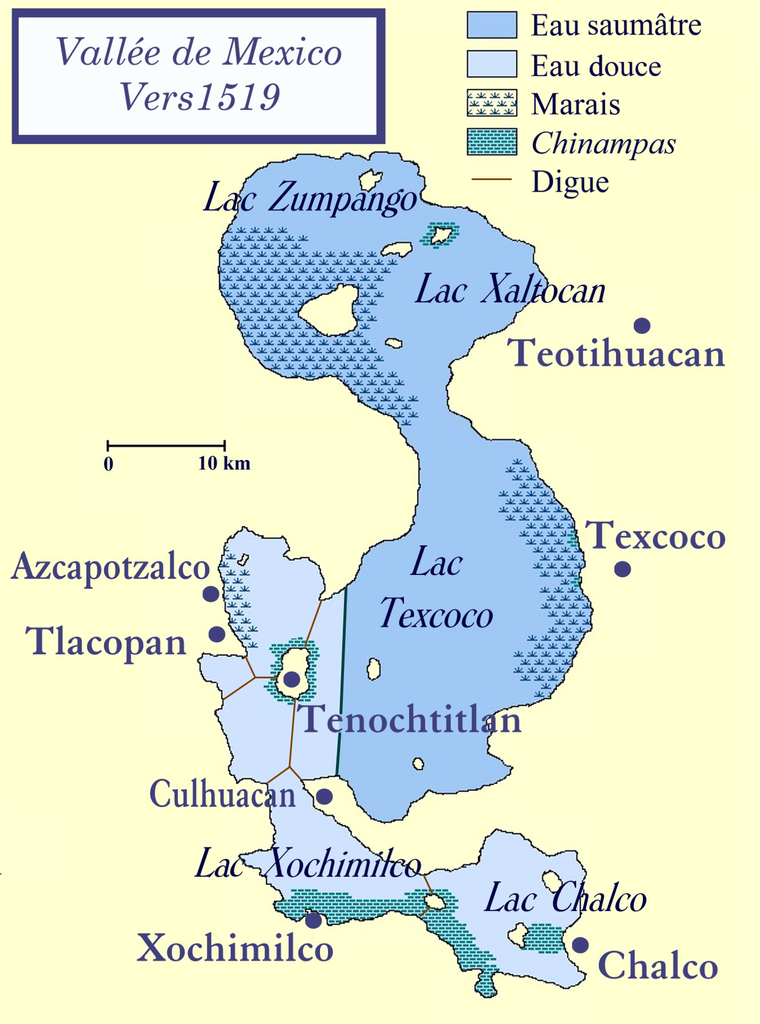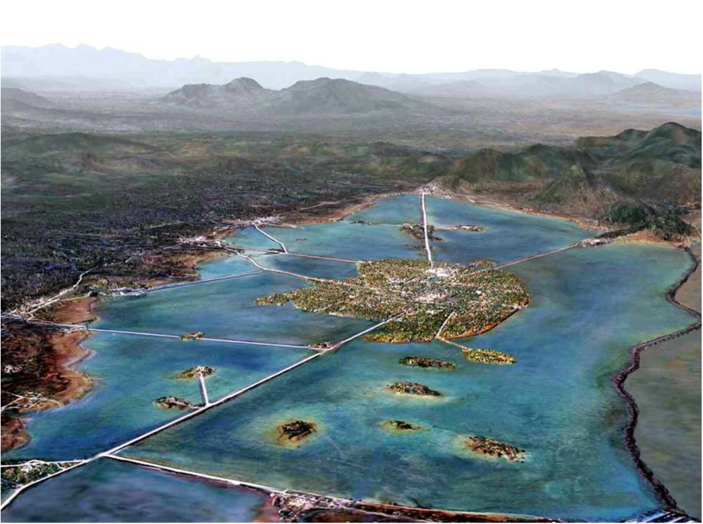 Tenochtitlan est bâtie sur des îles du lac Texcoco, faisant partie d'un système de 5 lacs dans la vallée de Mexico et qui ont à l'époque une superficie totale de 1500km2 (3 fois la taille du Lac de Genève).