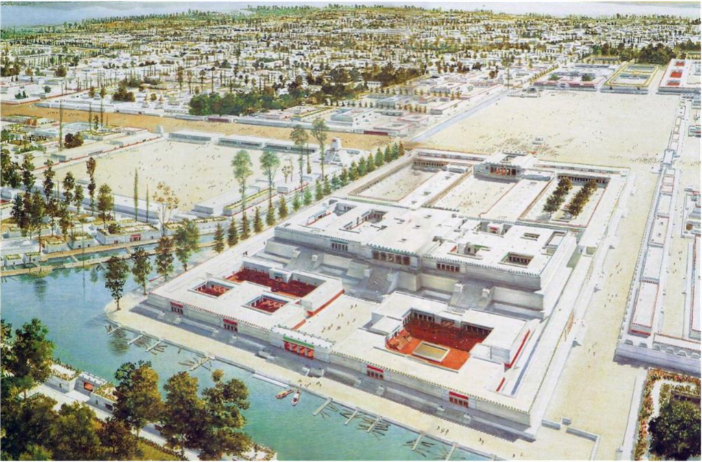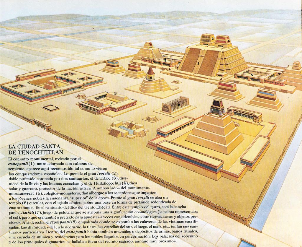 Au centre de la ville se trouvait un grand complexe de 45 bâtiments publics, des temples pour les différentes divinités dont le Templo Mayor, le palais de l'empereur ou le Calmecac, l'école réservée à la noblesse aztèque.