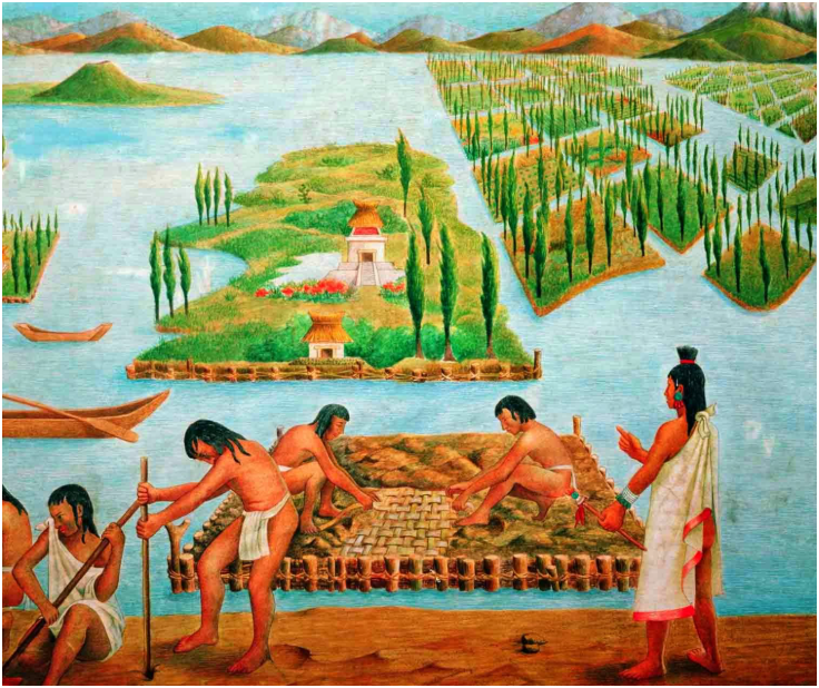 La ville s'agrandissait autour des îles d'origine grâce aux Chinampas (ou jardin Flottants), une technique d'agriculture Aztèque permettant de créer des parcelles rectangulaires cultivables très fertiles et entourées de canaux, on y cultivait du maïs, des haricots, piments, goyaves, pommes de terre, tomates, avocats et une multitude de fleurs pour les cérémonies religieuses et fêtes.