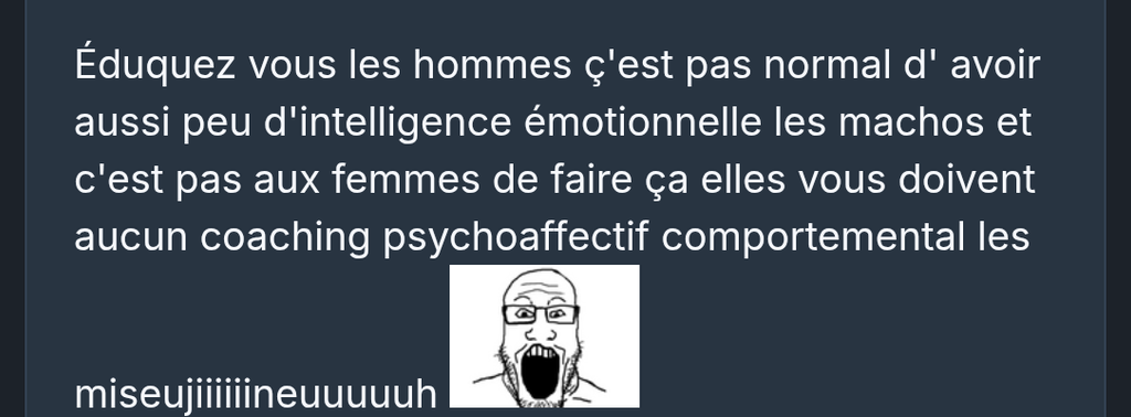 Pire... En plus tu verrais les coms de beaucoup de personnes en dessous (des meufs mais aussi quelques mecs) c'est tout bonnement insupportable... Qu'on me dise pas que les misandres qui l'ouvrent sur les réseaux ont de l'empathie et de la communication (parler à un mur serait plus constructif j'imagine) , la vérité c'est que les meufs qui ont répondu à l'étude le prétendent mais je pense que dans de nombreux cas c'est juste du chiqué comme le famosa pervers narcissique
