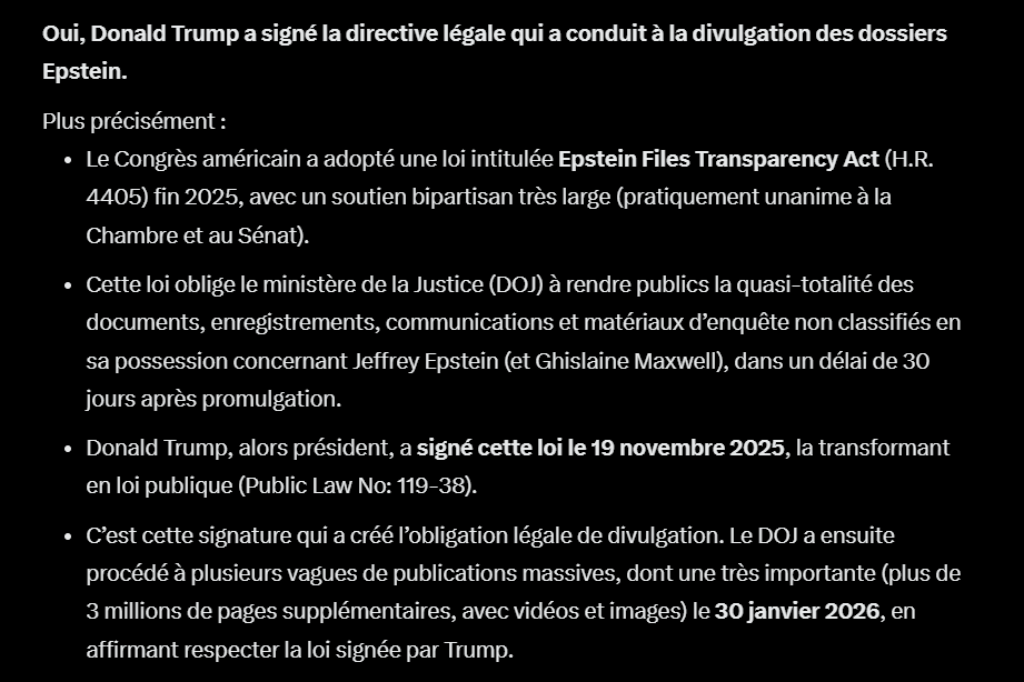 Je le répète, si Musk et Trump étaient coupables pourquoi avoir fait la promesse de campagne de divulguer l'entièreté des dossiers dans lesquels ils seraient mèlés à des activités illégales ?