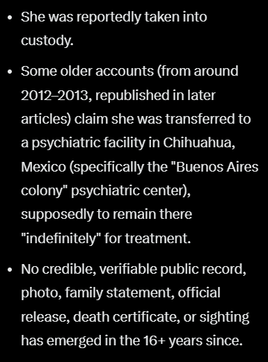 Aucun certificat de décès, pas de demande d'enquête aux autorités pour disparition de sa famille, rien, en gros elle a été internée et sa famille se tait surement car c'est pas très bonne publicité d'avoir un cas psychiatrique dans sa famille.