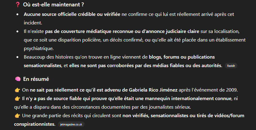 Il n’existe pas de couverture médiatique reconnue ou d’annonce judiciaire claire sur sa localisation, que ce soit une disparition policière, un décès confirmé, ou qu’elle ait été placée dans un établissement psychiatrique.