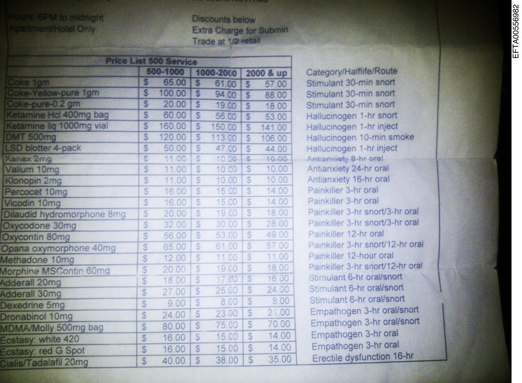 on a retrouver des fiches avec les prix des drogues utilisé sur ces dits yatch