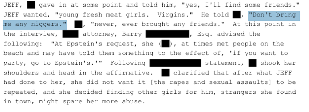 alors oui on peut violer des gosses et les traumatiser mais même epstein n'était pas assez fou et dérangé pour toucher à des noires