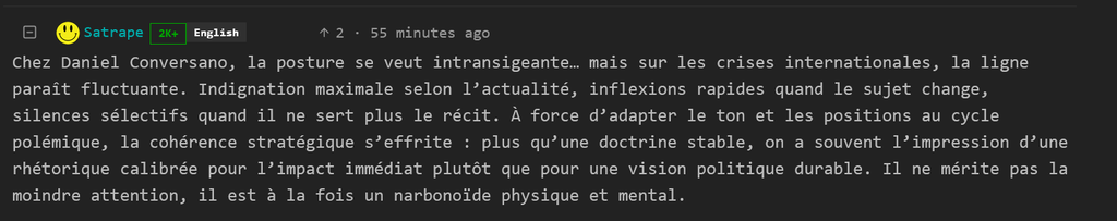 Pareil sur la politique internationale, où Conversano se contredit en permanence et change son narratif selon le sens du vent ?