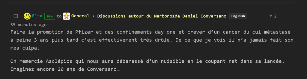 Je vois surtout des low IQ rager sur lui alors que quand on connait (au sens médical) que le développement d'un cancer du colon prend en moyenne 7 à 15 ans à se développer, cela n'a donc rien à voir avec la vaccination Covid...