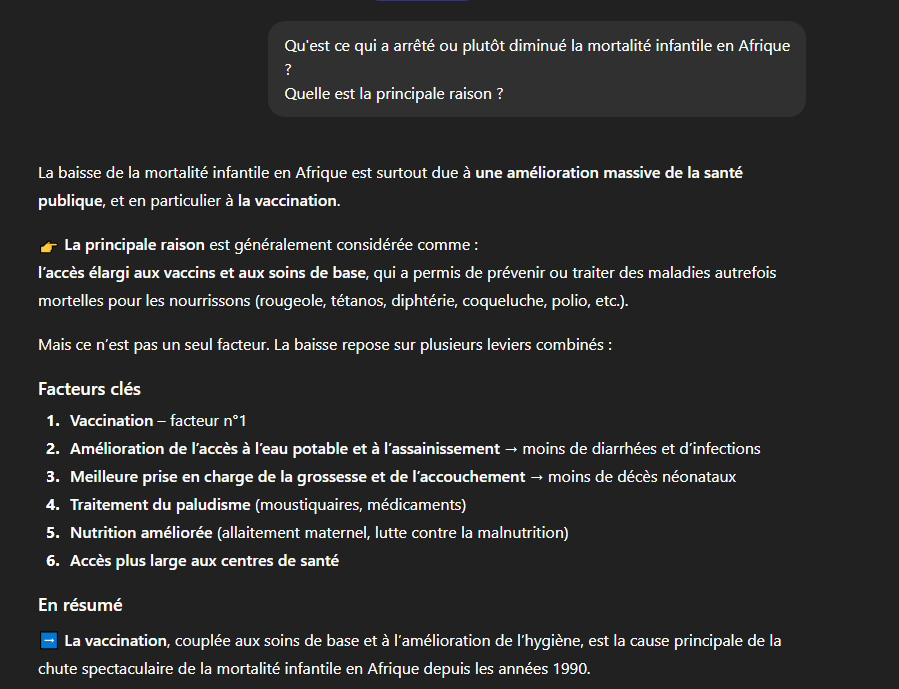 Oui tu répètes cet argument de tapin pharma, mais dans les faits, c'est comme en occident: la mortalité infantile a chuté avec les progrès en assainissements, en infrastructures, bien avant les vaccins