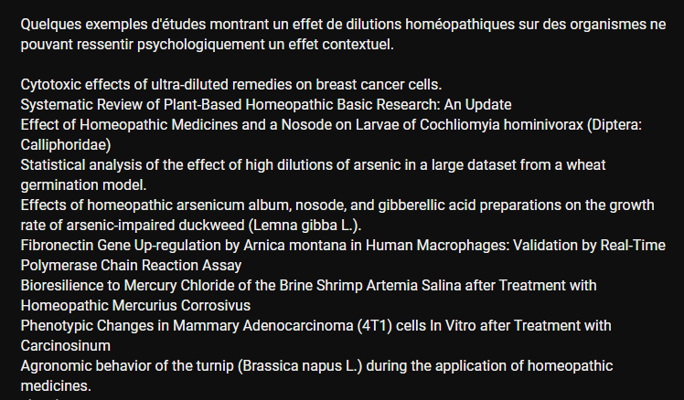 Quant à l'homéopathie, comment expliquer l'effet de dilutions homéopathiques sur des organismes ne pouvant être sensibles à un mécanisme psychologique (ex cellules in vitro, graines, larves d'insectes, lentilles d'eau)?