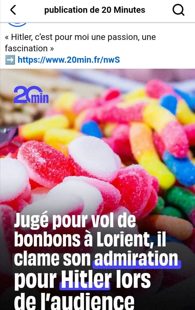 "Il était jugé devant le tribunal de Lorient (Morbihan) pour avoir volé en 2024 des bonbons et des sodas dans le local d’un club de pétanque du coin qu’il avait également dégradé. Lundi, l’audience, assez banale en l’apparence, a pourtant pris une tournure pour le moins nauséabonde quand ce jeune homme de 21 ans a profité de la tribune qui lui était offerte pour faire l’apologie du nazisme. « Hitler, c’est pour moi une passion, une fascination. Oui, je crois à l’idéologie de la race aryenne, de l’homme blond supérieur à tout le monde », a-t-il déclaré à la barre, selon des propos rapportés par Ouest-France.