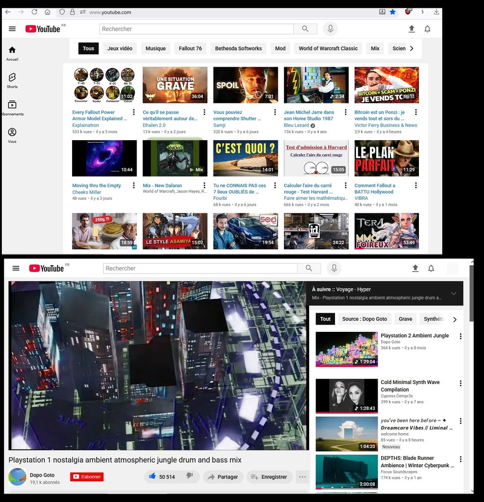 pareil j'utilise un script qui restaure les miniature plus petite et en affiche plus a l'ecran, YouTube a pas compris que l'ordinateur existe et que je suis pas myope, prendre tout l'ecran pour n'afficher que 6 videos c'est cancer