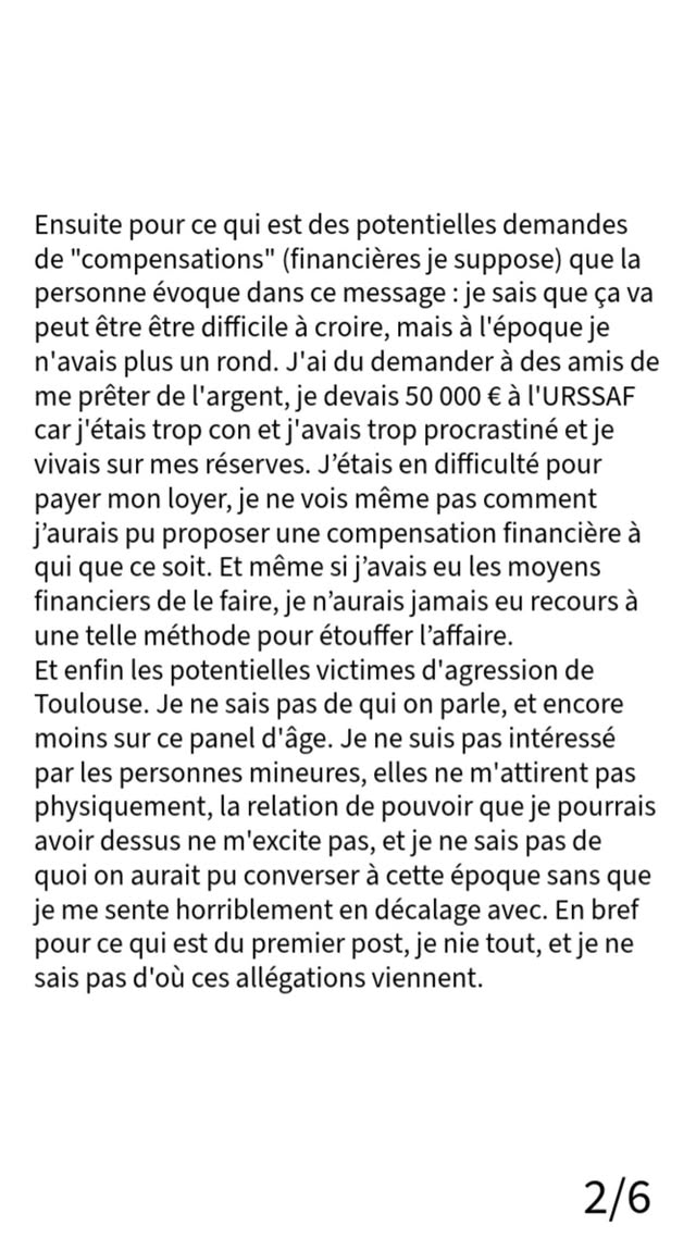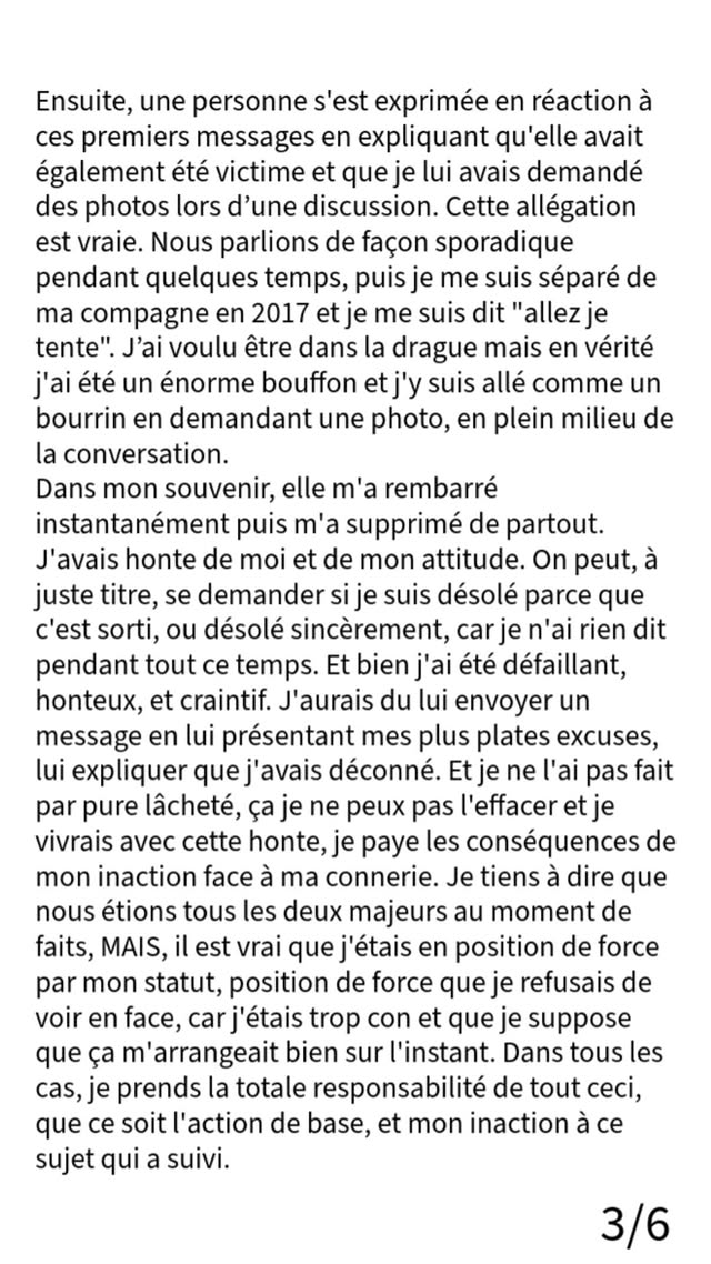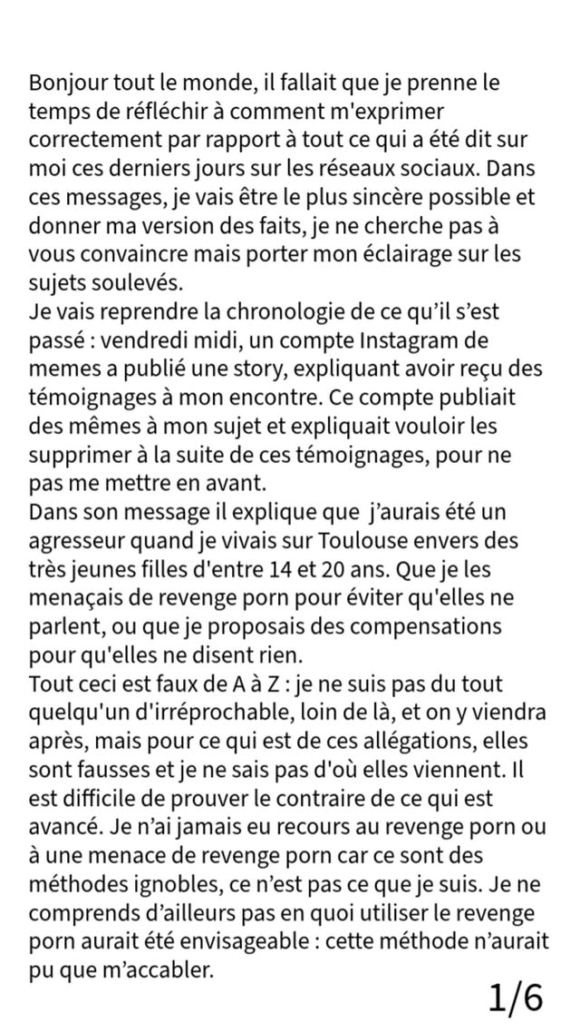 En gros il dit qu'il a jamais demandé de nudes à des meufs. Mais que peut être il ne se souvient juste plus et si c'est le cas c'était de l'humour selon lui et toujours selon lui il était une énorme merde pour avoir cet humour.