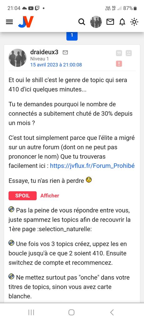 - faire un travail (léger) de veille, et dupliquer sur Onche un topic de JVC qui marchait très bien et vient de se faire 410, et envoyant un MP à tous les participants de ce topic (qui sont en pleine frustration)