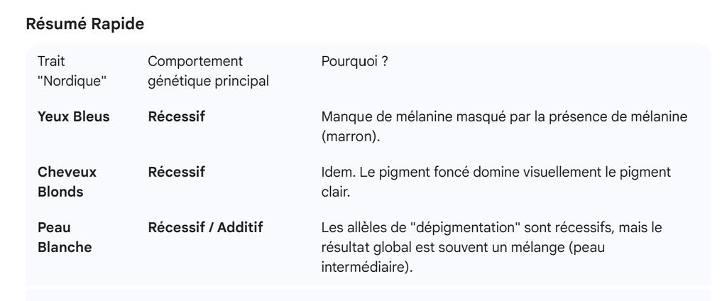 Nan la couleur de peau c'est codominant tu vas pas me dire que un métisse et un noir ont le même teint et plein de blancs ont les cheveux et les yeux foncés hein c'est des caractères qui sont dans l'écrasante majorité chez les blancs mais y'a des exceptions (comme chez les mélanesiens qui peuvent être blonds naturels en étant noirs de peau) et un alléle récessif (et de toute façon la couleur des yeux ou des cheveux c'est pas une hérédité mendelienne ç'est plus complexe) ne va pas disparaître avec le métissage le caractère qui code peut réapparaître dans la descendance et personnellement j'ai déjà vu une fillette métisse rousse et pourtant la rousseur c'est souvent couplé a un teint très pâle en mode phototype 1 mais faut croire que la génétique c'est plus compliqué que ça